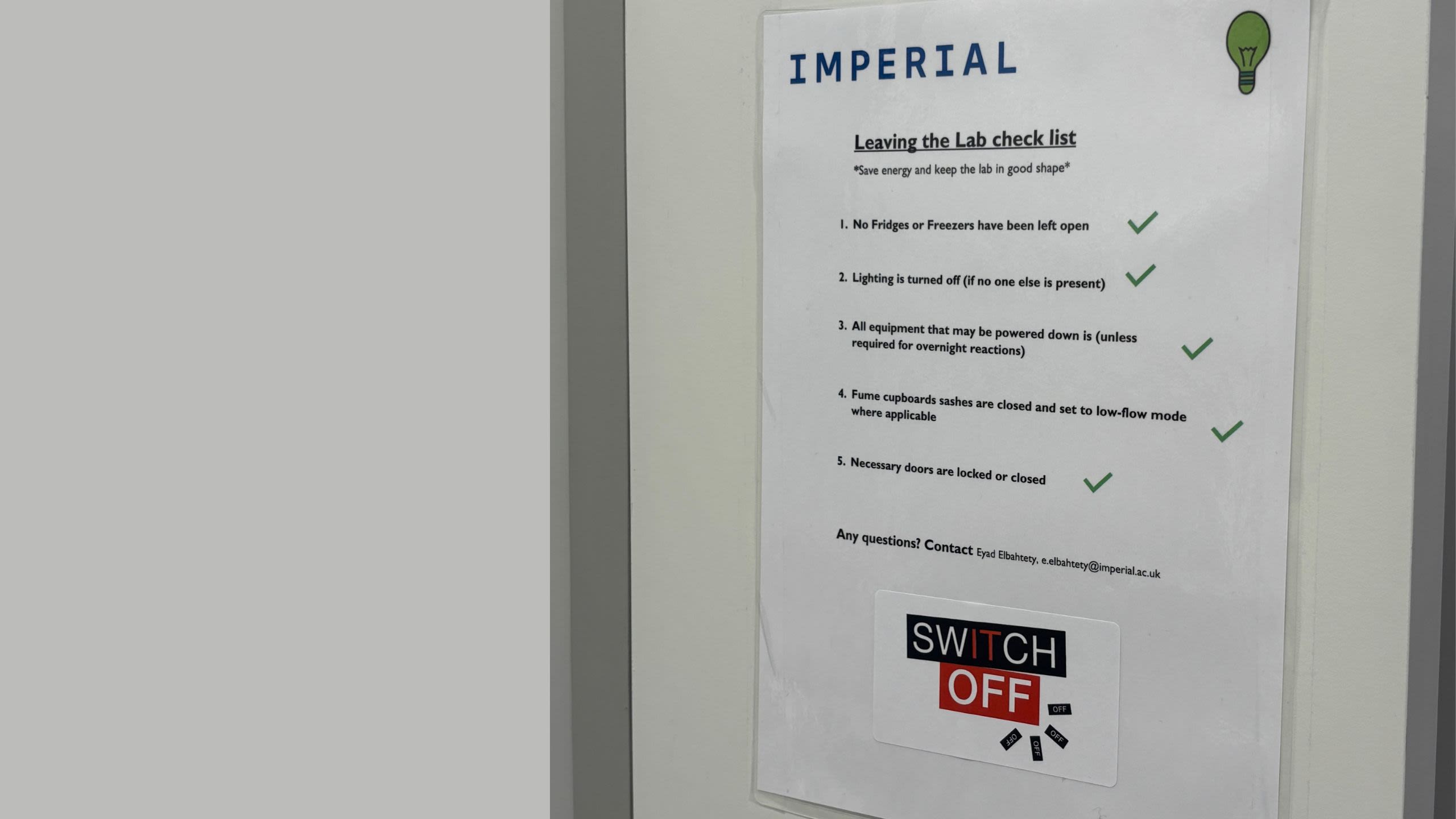 Lab checklists pinned on lab doors are a convenient reminder for all staff to ensure their working practices and environment are as sustainable as possible. They must, for instance, ensure that the new, more eco-friendly -70C freezers are not left open and that all equipment not in overnight use is switched off.