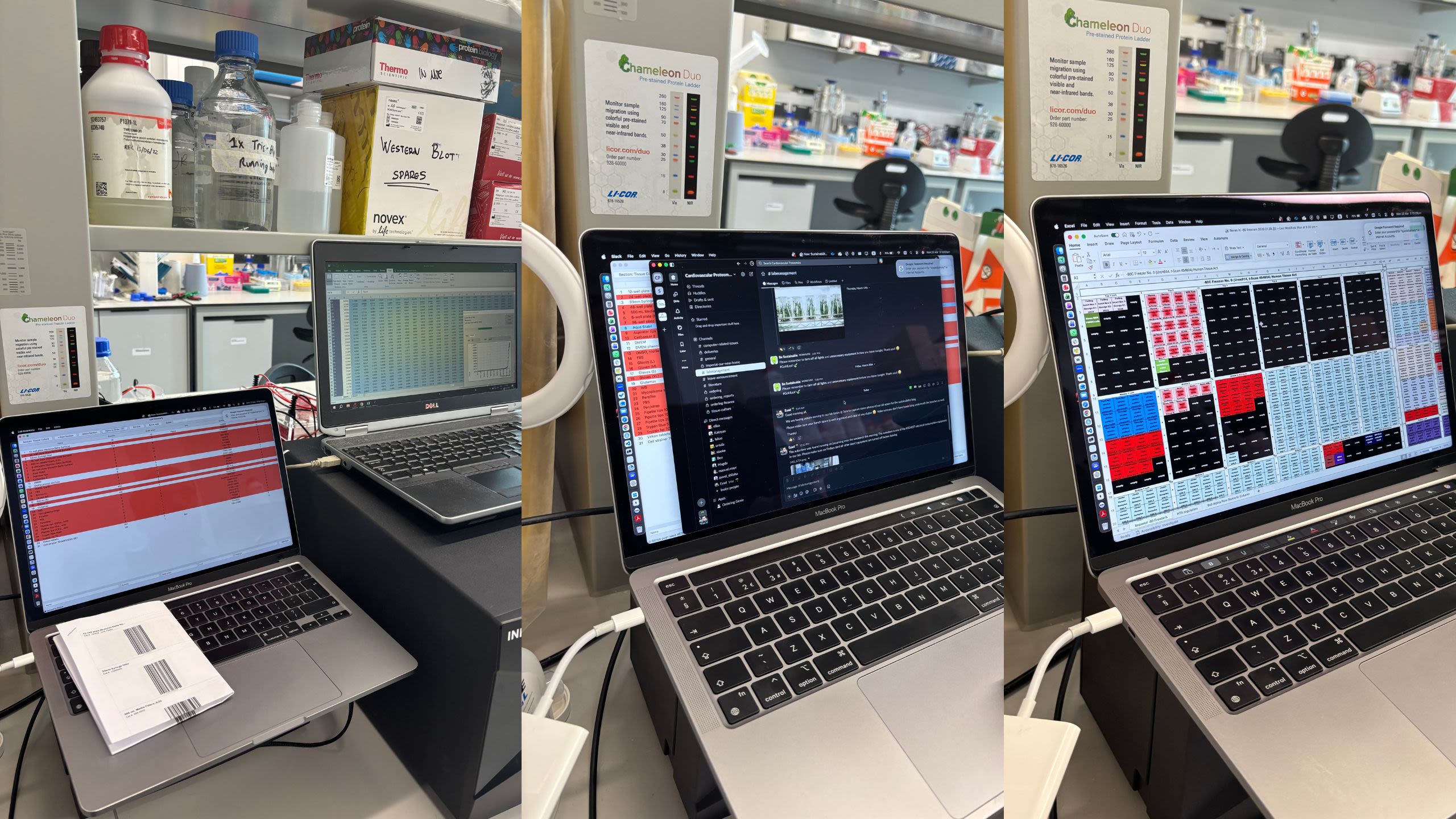 Automated lab inventory software has been installed to reduce leftover consumables and chemicals. It shows the current inventory with barcodes for different items. If something is close to running out, it will show in red so it can be re-ordered at the right time. The team communicate on Slack channels with multiple sustainability bots which send reminders and reports - to ask people to turn off lights and equipment, for example.
